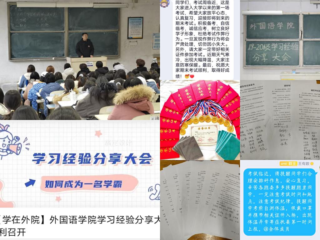 召开学习经验分享大会,针对大一对应专业的学生开设学习经验分享大会,高年级学长学姐根据各语种学习的实际情况和自己的学习经历,给学弟学妹们分享学习经验,交流学习心得,激发新生的学习动力,进一步促进其明确学习目标和努力方向,发挥传帮带作用。